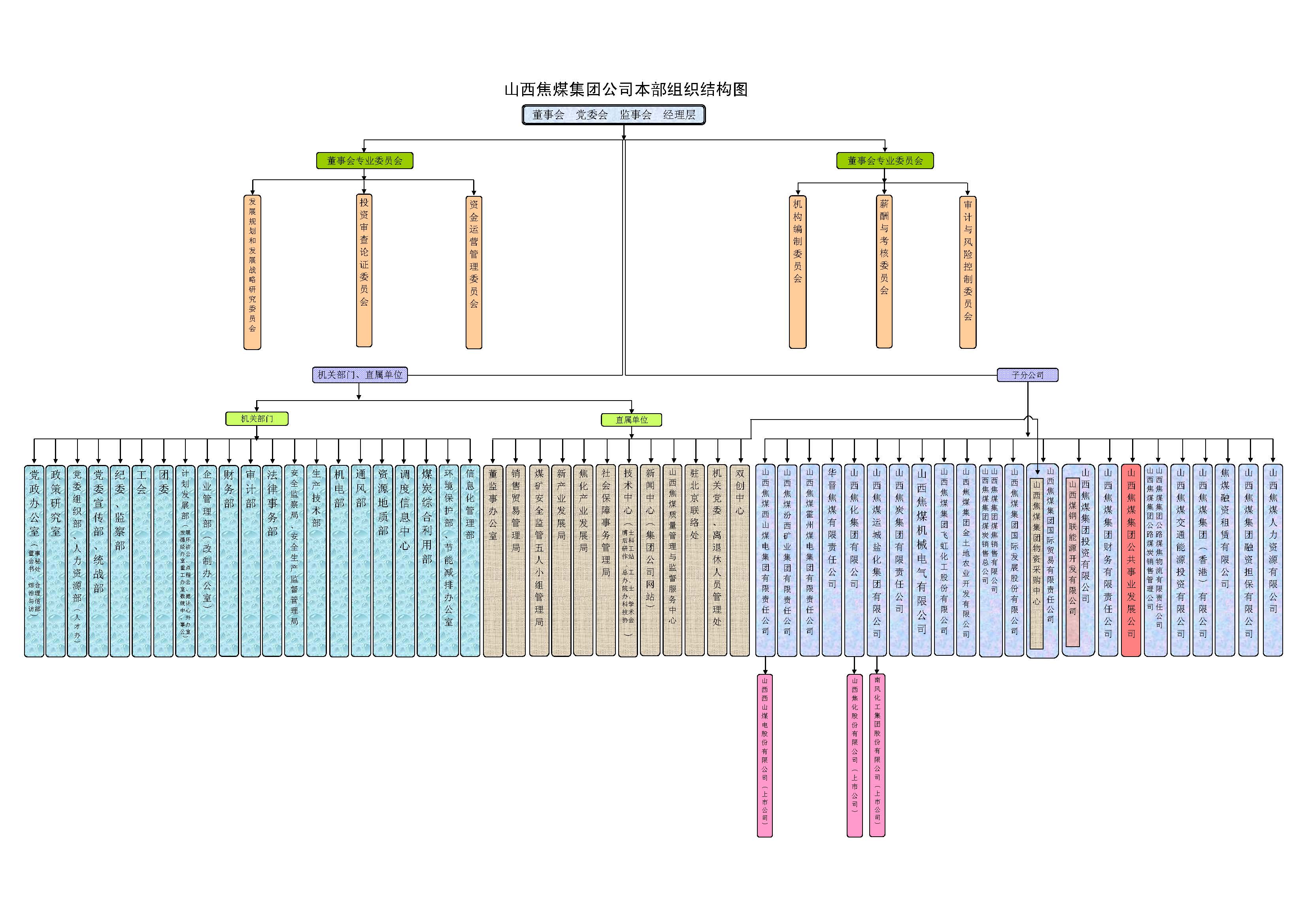 山西焦煤组建于2001年10月,属山西省国有独资企业,总部位于山西省会太原市,下有西山煤电、汾西矿业、 霍州煤电、华晋焦煤、山西焦化、运城盐化、山西焦炭、机械电气公司、飞虹化工、金土地公司、销售总公司、国际发展公司、国际贸易公 司、投资公司、财务公司、公共事业公司、公路物流公司、交通能投公司、香港公司、融资租赁公司、融资担保公司等22个子分公司和西山 煤电股份公司、山西焦化股份公司、南风化工股份公司3个A股上市公司。